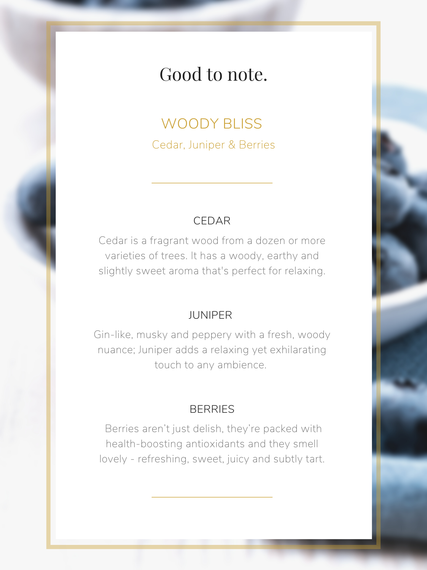 This aromatic blend of Cedar infused with Juniper and Berries has a captivating vibe perfect for relaxing rituals after a long day. Leave the boardroom (and bored room) behind.
